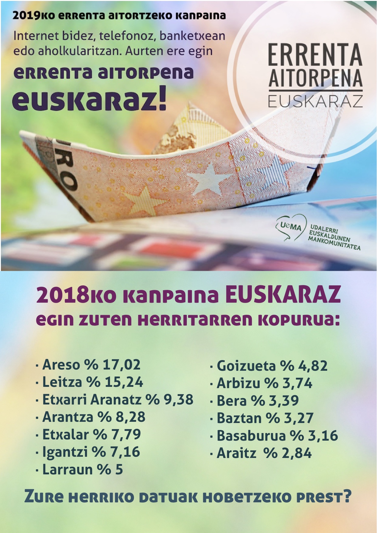 Administrazioa euskalduntzeko duen eraginagatik, euskararen normalizaziorako bidean udalerri euskaldunak egiten ari diren beste urrats bat da errenta aitorpena ahalik eta herritar gehienek euskaraz egitea. Urratsa sendoa izan dadin, ordea, herritarren babesa eta parte-hartzea ere beharrezkoa da, eta hautu horretan eragin nahi du aurten ere UEMAk, udalekin eta beste hainbat erakunde publikorekin elkarlanean abiarazitako kanpainak, euskarak dagokion lekua izan dezan administrazio publikoan ere.