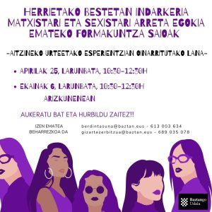 Baztango Udaleko Gizarte Zerbitzuek eta Berdintasun Zerbitzuak “Besta giroan indarkeria matxista eta sexistari arreta egokia emateko formakuntza saioak” antolatu dituzte, besta seguruago eta parekideagoak sustatzeko helburuarekin. Bi saio izanen dira, eta herritarrak bi egunetako batera etortzera gonbidatu nahi dituzte: apirilaren 25ean edo ekainaren 6an, larunbatetan, 10:30etik 12:30era, Arizkuneneako hitzaldi aretoan.