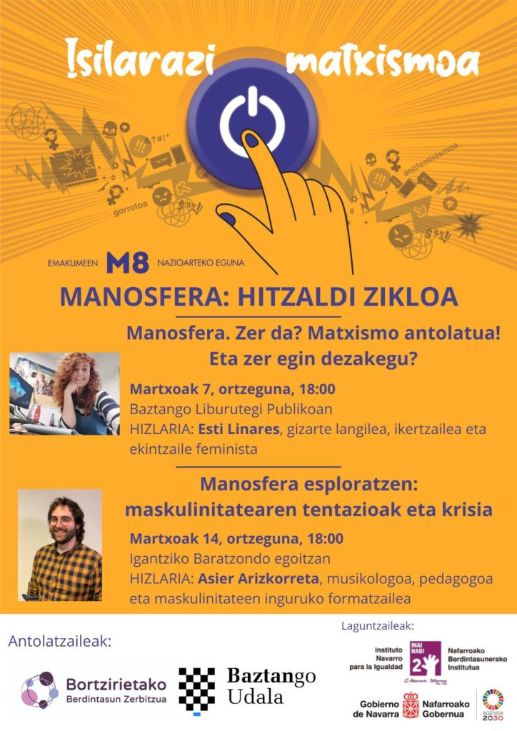 k eta aurrez aurre dauzkagun nortasun krisiak jorratuz. Alfa kulturaren eragina, genero rolen bilakaera eta misoginia eta “toxikotasuna” bezalako alderdi problematikoak aztertuko ditugu. Helburua da maskulinitate garaikideari buruz hausnartzea eta haren adierazpen osasungarriago eta orekatuago baterako bideak bilatzea. Maskulinitateetatik eta gizon bezela nola aurre egin ere aztertuko dugu, izan ere Manosferako ideia eta argudio asko gure inguruetako errealitatera salto egin dute jada.