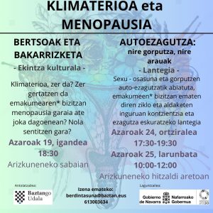 Guzti honetaz aritzeko eta menopausia eta klimaterioaren inguruan sortzen diren kezka, beldurrak etab. Lantzeko, Baztango Gizarte eta Berdintasun Zerbitzuek, Baztango Berdintasun Batzordearekin elkarlanean, ekintza ziklo hau antolatu dugu: