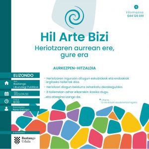 HIL ARTE BIZI egitasmoaren aurkezpen hitzaldia: 2022-09-20 asteartea, 18:00etan, Elizondon, Baztango Liburutegi Publikoan. Elizondon egingo dira “Hil Arte Bizi” tailerrak, urria-azaroa bitartean, herritarrak heriotzaren aurrean dituzten eskubideak ezagutu eta erabakiak hartzen laguntzeko helburuarekin. Baztango Udalak egindako apustua da, egungo gizartean heriotzaren gaia naturalizatu eta gai honen inguruan herritarrak ahalduntzeko asmoz. Tailerrei buruzko azalpen eta zehaztasun guztiak 644 126 091 telefonora deituta jaso daitezke.